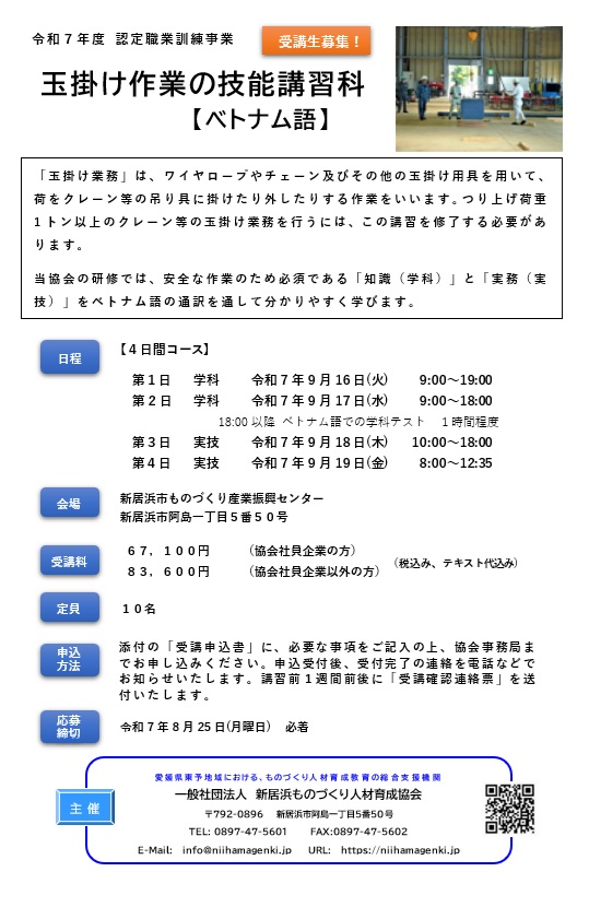 2025-07-01 / 最終更新日時 : 2025-06-18 新居浜ものづくり人材育成協会 労安法 技能講習・安全衛生教育 玉掛作業の技能講習科 ( ベトナム語 ) のご案内【令和7年9月16日~9月19日 開催】 ベトナム語の通訳を介した「玉掛作業の技能講習」を開催いたします。 2日目の講習後に行う学科テストは、ベトナム語の問題を用意します。 講習会の詳細 こちら 申込書 ( PDF版 ・ Word版 )