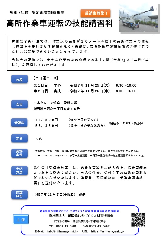 2025-09-01 / 最終更新日時 : 2025-08-18 新居浜ものづくり人材育成協会 労安法 技能講習・安全衛生教育 高所作業車運転の技能講習科 のご案内【令和7年11月25日、11月26日 開催】 「高所作業車運転の技能講習科」を開催いたします。 作業床の高さが10メートル以上の高所作業車の運転業務に必要な技能講習です。 講習会の詳細は こちら申込書 ( PDF版 ・ Word版 )