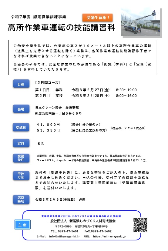 2025-12-01 / 最終更新日時 : 2025-11-28 新居浜ものづくり人財育成協会 労安法 技能講習・安全衛生教育 高所作業車運転の技能講習科 のご案内【令和8年2月27日、2月28日 開催】 「高所作業車運転の技能講習科」を開催いたします。 作業床の高さが10メートル以上の高所作業車の運転業務に必要な技能講習です。 講習会の詳細は こちら 申込書 ( PDF版 ・ Word版 )
