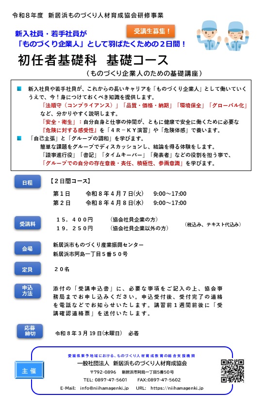 2026-02-02 / 最終更新日時 : 2026-01-30 新居浜ものづくり人財育成協会 協会企画講座 初任者基礎科 基礎コース (ものづくり企業人のための基礎講座) のご案内【令和8年4月7日~4月8日 開催】 座学と演習の両面から「法順守」「品質・価格・納期」「環境保全」「安全・衛生」等、 新入社員、若手社員のうちに身につけておくべき知識の習得を目的とした講習会を開催します。 講習会の詳細は こちら カリキュラムは こちら 申込書 ( PDF版 ・ Word版 )