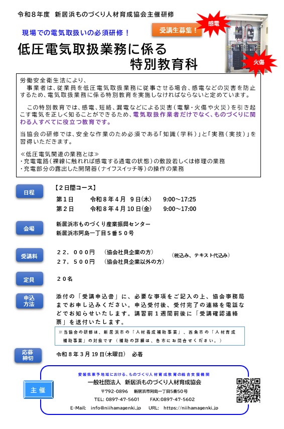 2026-02-02 / 最終更新日時 : 2026-03-11 新居浜ものづくり人財育成協会 労安法 特別教育 【受付終了】 低圧電気取扱業務に係る特別教育科 のご案内【令和8年4月9日~4月10日 開催】 定員に達しましたので、受付を終了いたしました(令和8年3月11日) 低圧電気取扱い業務に従事する場合に必要となる特別教育を開催します。 「知識(学科)」と「実務(実技)」の両方を習得できるので、電気取扱作業者以外の方の知識習得にもご利用ください。 講習会の詳細は こちら 申込書 ( PDF版 ・ Word版 )