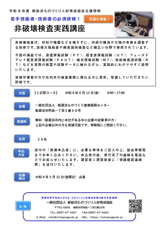 Wed, 01 Apr 2026 01:00:00 +0000https://niihamagenki.jp/?p=6445物を壊さずに内部構造や欠陥の有無を調査する技術を習得するために、 実際の装置や試験データを扱いながら講義を進めます。 溶接作業者、検査業務に携わる方は、ぜひ受講をご検討ください。