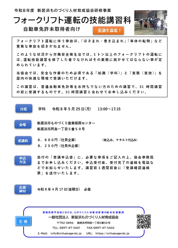 Warning: Cannot modify header information - headers already sent by (output started at /usr/home/mw2pe0ya7s/www/htdocs/index.php:1) in /usr/home/mw2pe0ya7s/www/htdocs/wordpress/wp-includes/feed-rss2.php on line 8 フォークリフト運転の技能講習科 | 一般社団法人新居浜ものづくり人材育成協会