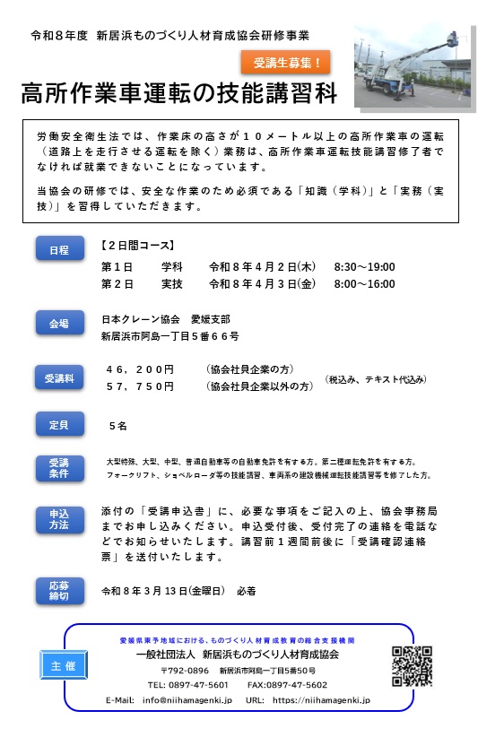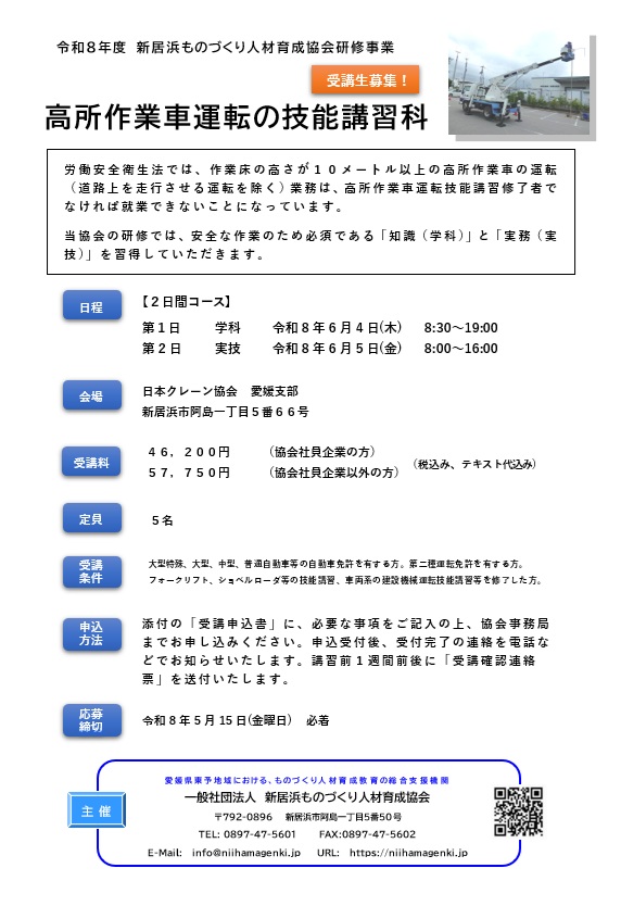 高所作業車運転の技能講習科 のご案内【令和8年6月4日、6月5日 開催】