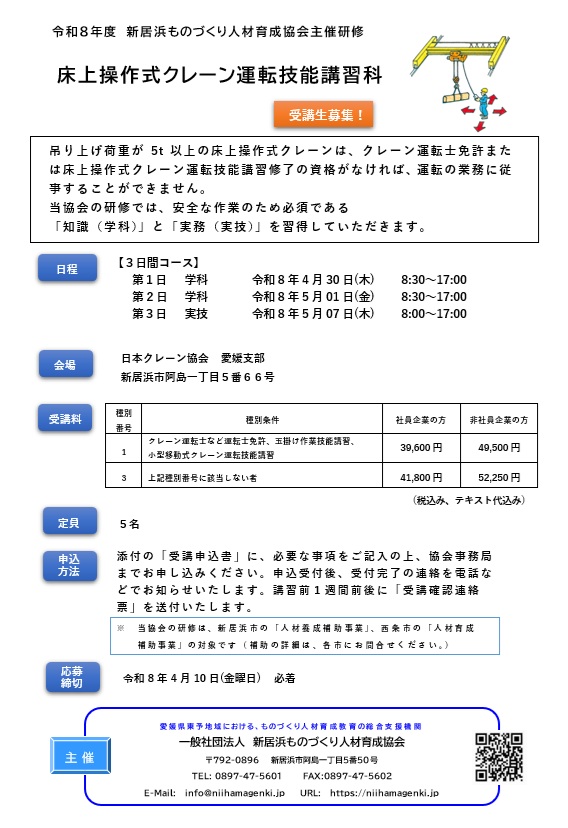 床上操作式クレーン運転技能講習科 のご案内【令和8年4月30日、5月1日、7日 開催】