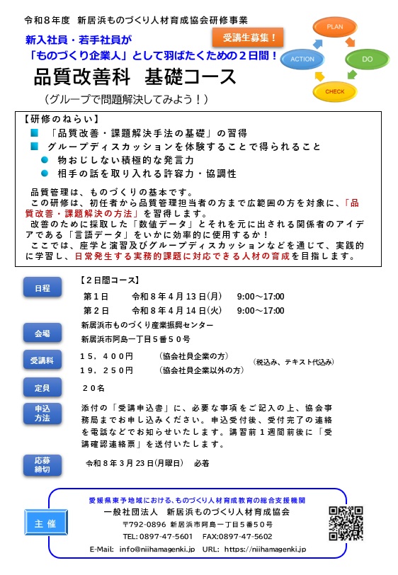 品質改善科 基礎コース(グループで問題解決してみよう!) のご案内 【令和8年4月13日~14日 開催】