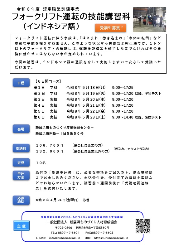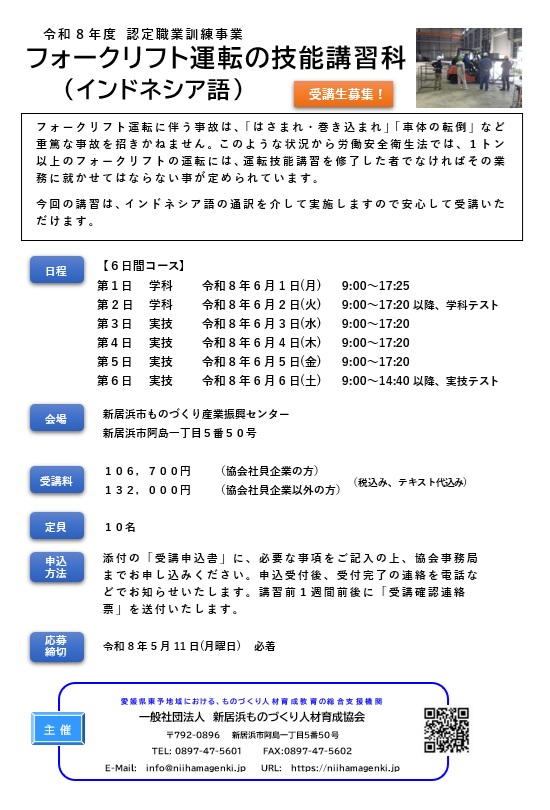 フォークリフト運転の技能講習科【インドネシア語】 のご案内【令和8年6月1日~6月6日 開催】