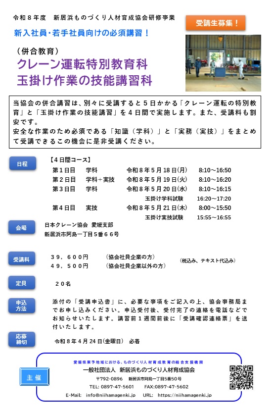 (併合教育)クレーン運転特別教育科 玉掛け作業の技能講習科 のご案内【令和8年5月18日~5月21日 開催】