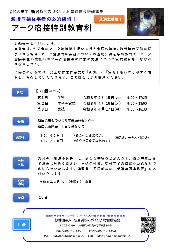 アーク溶接特別教育科 のご案内【令和8年4月15日~4月17日 開催】