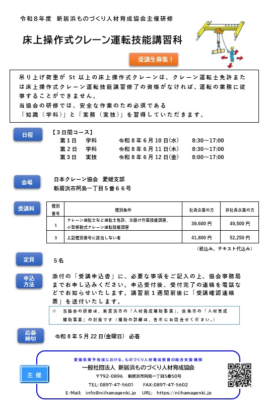 床上操作式クレーン運転技能講習科 のご案内【令和8年6月10日~6月12日 開催】